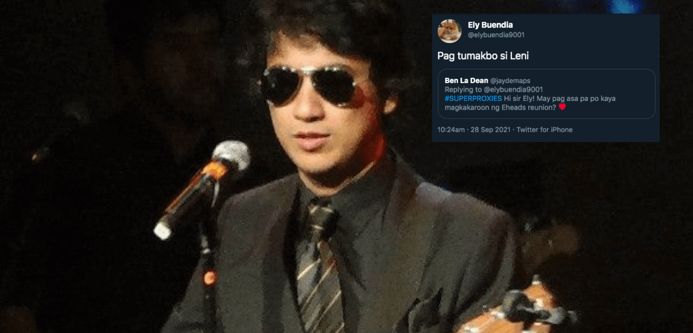 MANILA, Philippines – Nagtweet ang rock icon na si Ely Buendia ang kanyang mga tagahanga na maaaring mangyari ang muling pagsasama ng kanyang bandang ‘90s na Eraserheads kung ihayag ni Bise Presidente Leni Robredo ang kanyang kandidatura para sa darating na 2022 pambansang mga botohan.